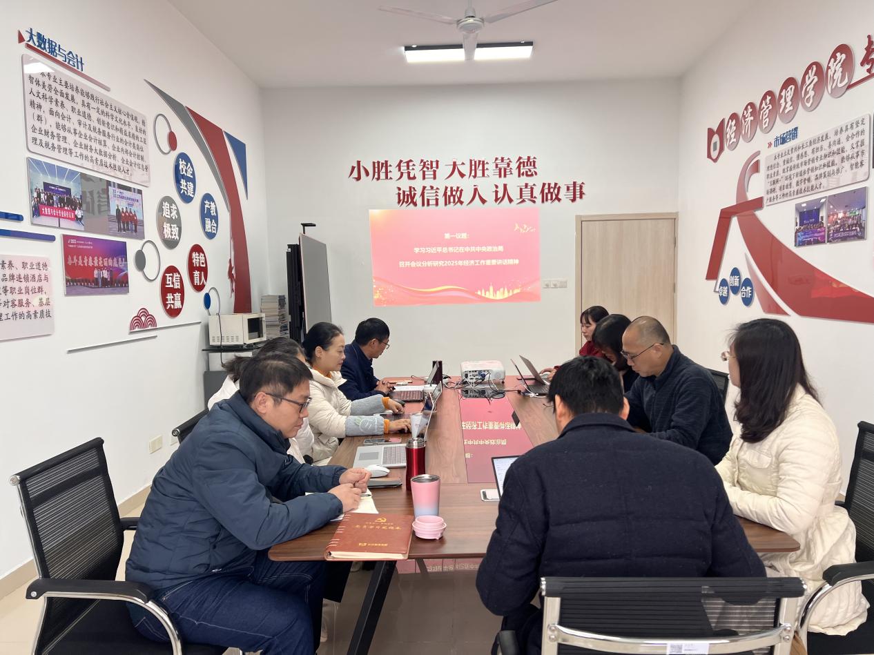 会议伊始,徐标带领全体成员进行第一议题学习,传达习近平总书记在中共中央政治局召开会议分析研究2025年经济工作重要讲话精神。他要求,全体成员要深刻领会其核心要义,引导师生关注经济体制改革动态的同时,积极探索教育教学改革方式方法,全方位提升教学、科研和管理能力,提高人才培养质量。