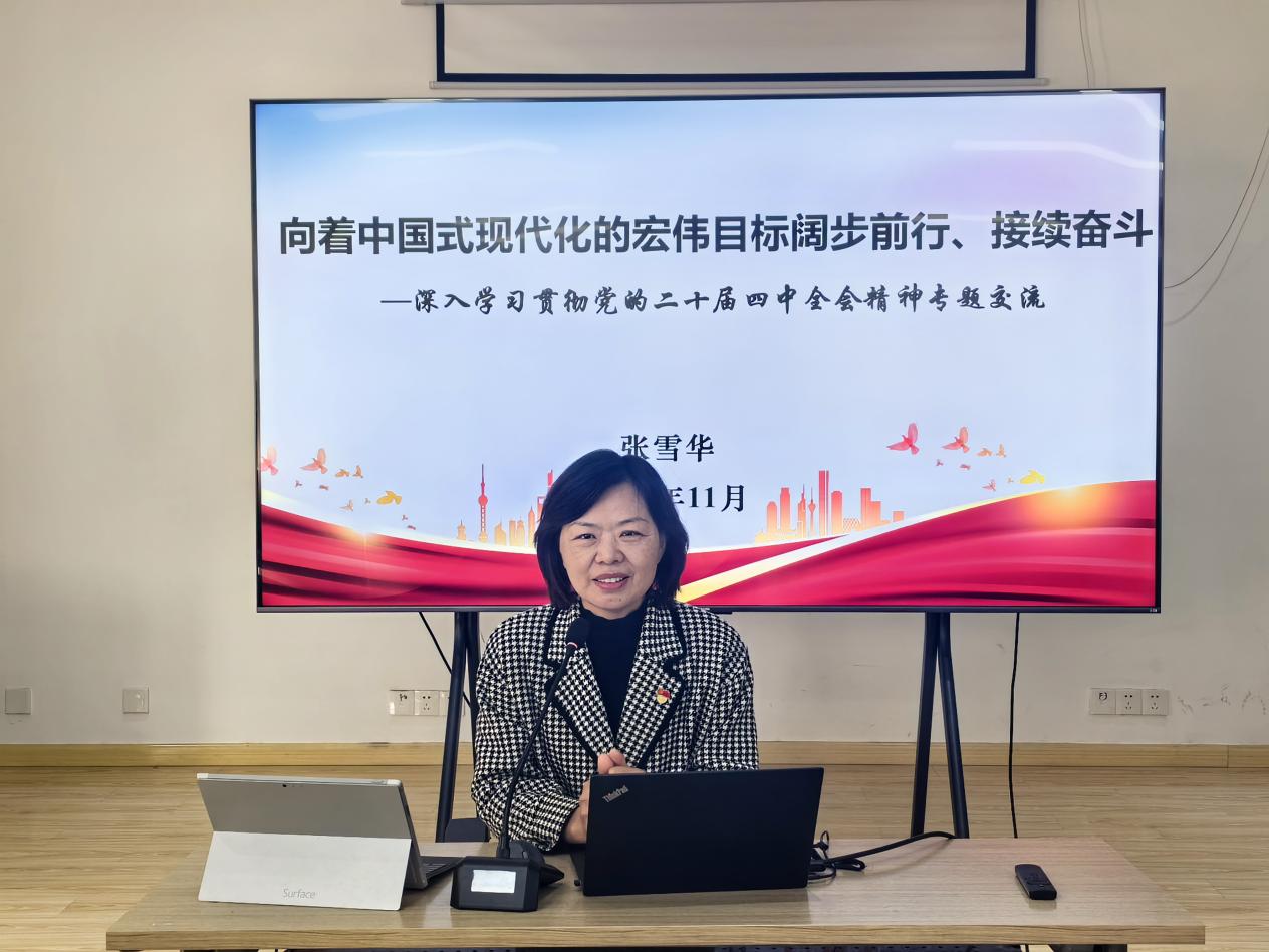 报告会上,张雪华以《向着中国式现代化的宏伟目标阔步前行、接续奋斗》为主题,围绕党的二十届四中全会精神进行了系统全面、深入浅出的解读。她首先介绍了全会基本情况,强调此次全会是在我国全面建设社会主义现代化国家关键时期召开的重要会议,为今后发展指明方向、提供遵循,而全会最重要的成果便是审议通过了《中共中央关于制定国民经济和社会发展第十五个五年规划的建议》这一纲领性文献。针对"十五五"时期的发展定位与规划部署,从三个维度展开重点讲解。一是深刻把握"十五五"时期承前启后的关键地位,明确这一时期既要巩固"十四五"时期发展成果,更要为基本实现社会主义现代化夯实基础、全面发力;二是牢牢把握以习近平新时代中国特色社会主义思想为指导的发展方针,始终锚定高质量发展首要任务,确保"高质量发展取得显著成效、科技自立自强水平大幅提高"等核心目标落到实处;三是全面领会各领域战略任务与举措,鼓励教职工结合工作实际,在教育教学与科研实践中找准服务国家战略的切入点,主动对接现代化产业体系建设、区域协调发展等重大部署。