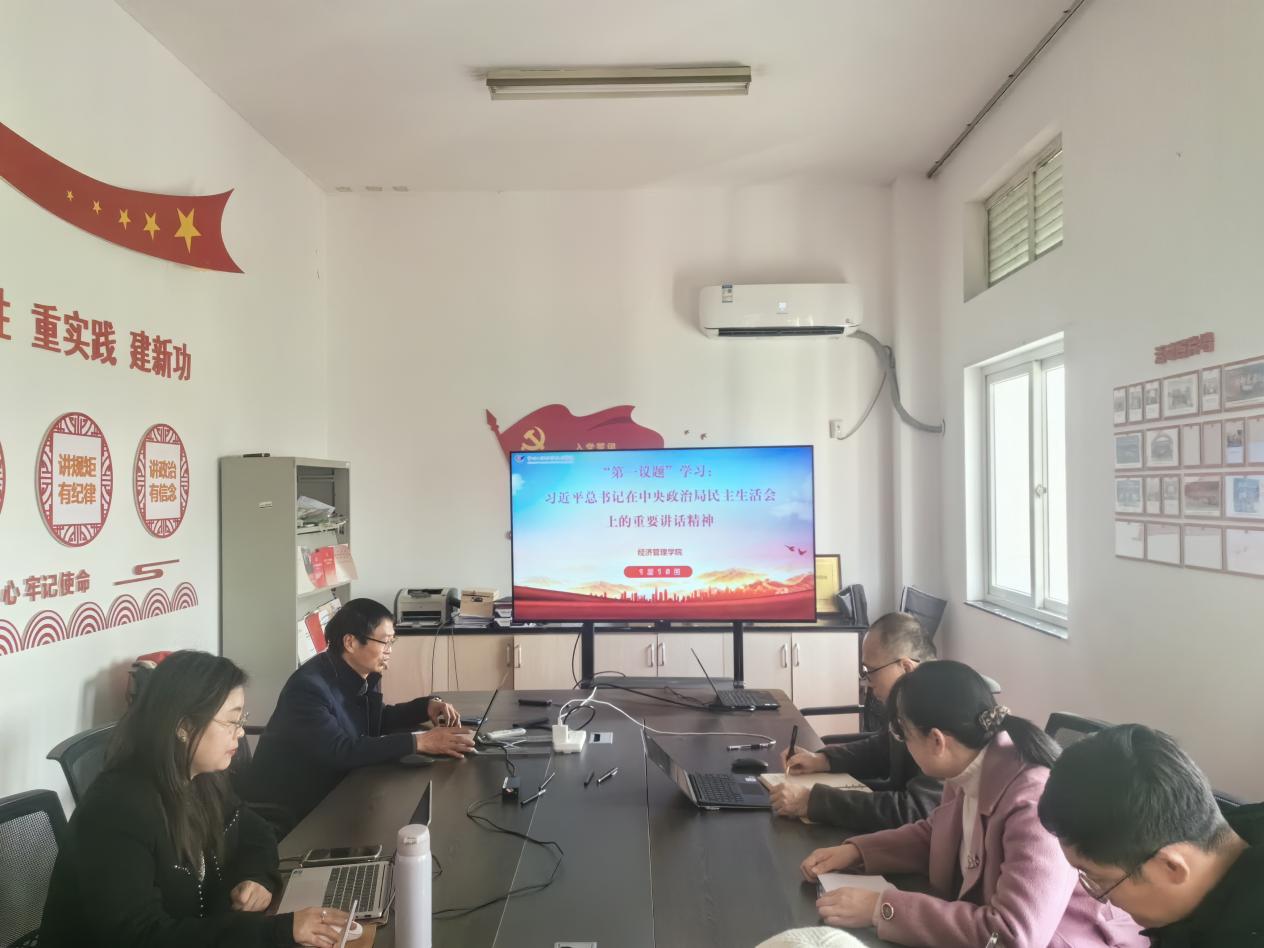 为深入学习领会习近平总书记在中央政治局民主生活会上的重要讲话精神,全面贯彻2026年全国教育工作会议部署要求,助推学院高质量发展再上新台阶,1月15日,经管学院党总支理论学习中心组开展本年度第一次集体学习。党总支委员、班子成员、两办主任、教研室主任参加了本次学习,学习会由党总支书记徐标主持。