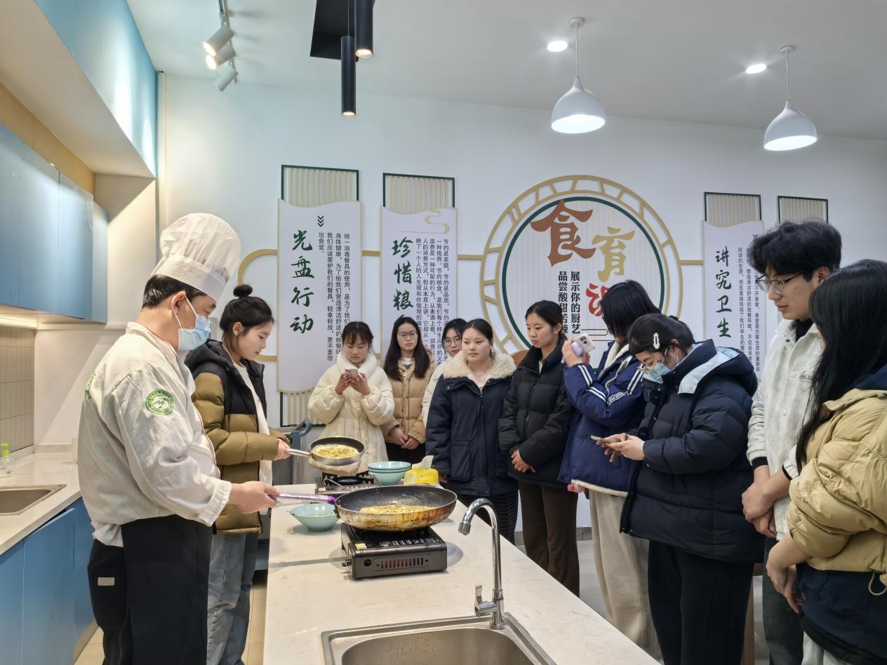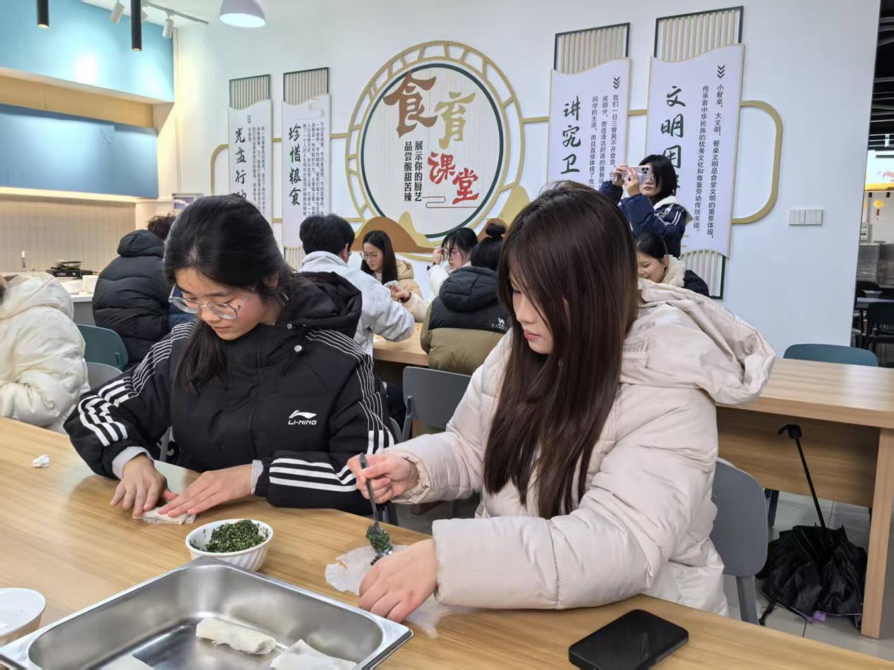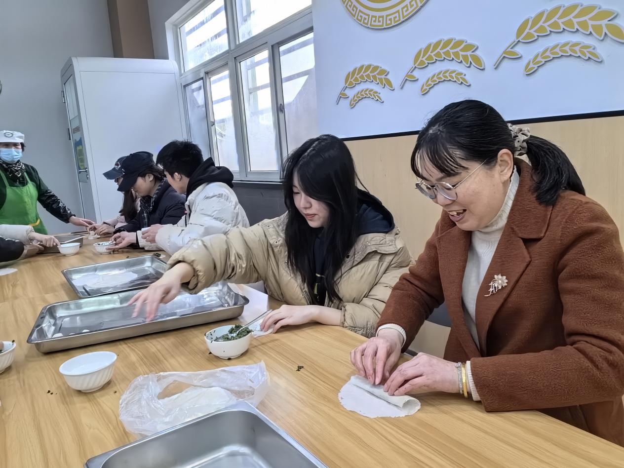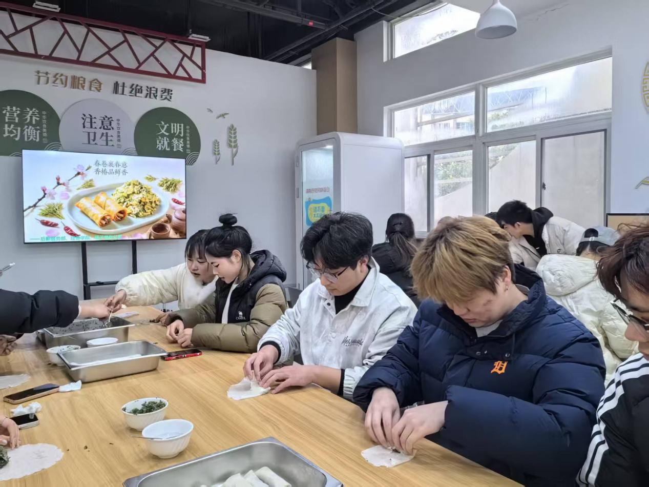 活动伊始,学院党总支副书记华亚围绕春季节气特点,生动讲解了春卷、香椿的民俗渊源与营养价值。春卷寓意“一卷藏春”,香椿作为时令“树上蔬菜”,承载着人们尝鲜迎新的生活智慧。从食材由来到节气食俗,同学们在轻松的氛围中走近传统,品味自然时令背后的文化意蕴。在实践环节,同学们分组协作,开启“春日第一卷”的制作。摊皮、包馅、卷边,一道道工序在食堂师傅的指导下逐渐熟练;香椿切碎与蛋液融合,入锅煎至金黄,浓郁的香气弥漫整个厨房。大家在动手操作中沉浸其中,在协作配合中完成从食材到美食的转化。经过一番忙碌,热气腾腾的春卷和香椿煎蛋陆续出锅,同学们围坐在一起,品尝着自己的劳动成果,分享着制作心得,共享厨房里洋溢着满足与喜悦的氛围。