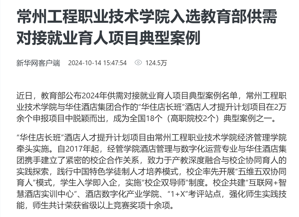 (2) 酒店人才提升计划入选教育部供需对接就业育人典型案例,获新华社、科技日报、学习强国等中央主流媒体报道。