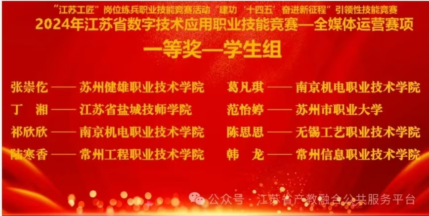 (2)江苏省数字技术应用职业技能竞赛(全媒体运营赛项)一等奖。该比赛全方位考查选手全媒体内容生产与应用综合技能素质,重点突出生成式人工智能(AIGC)在全媒体运营领域中的应用。